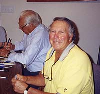 Don Larsen (pictured left) signs an autograph for a member of the Museum. In baseball,